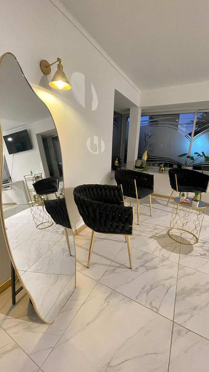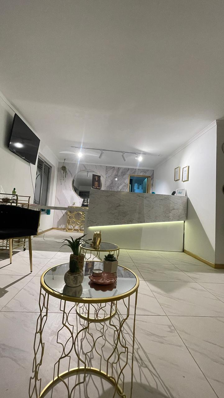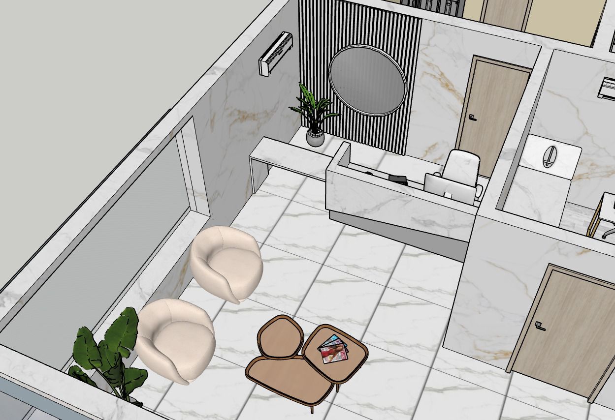 - Recepción y área de espera diseñadas como punto focal del proyecto, con mesón principal revestido en símil mármol blanco veteado, iluminación LED indirecta inferior que realza el volumen y aporta una atmósfera elegante y sofisticada. El espacio se complementa con mobiliario de líneas curvas, estructura metálica en tono dorado y tapicería oscura, generando un contraste moderno y acogedor.