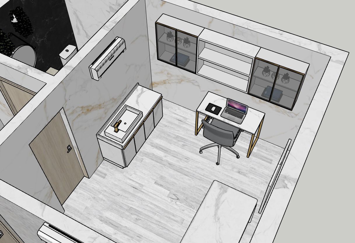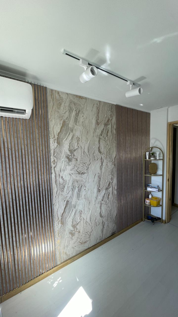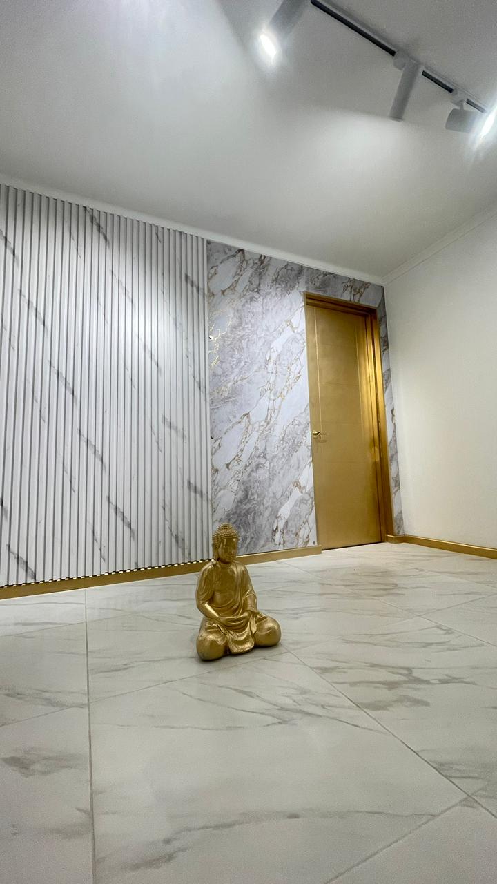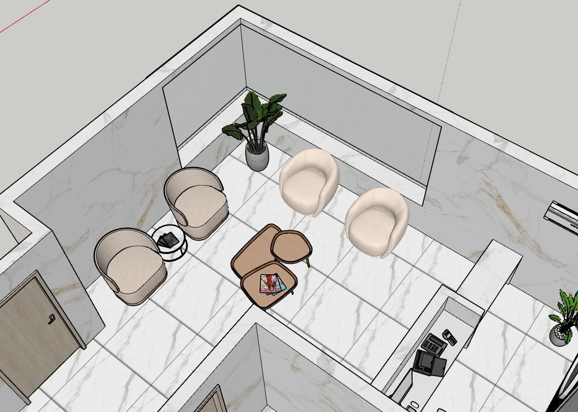 - Recepción y área de espera diseñadas como punto focal del proyecto, con mesón principal revestido en símil mármol blanco veteado, iluminación LED indirecta inferior que realza el volumen y aporta una atmósfera elegante y sofisticada. El espacio se complementa con mobiliario de líneas curvas, estructura metálica en tono dorado y tapicería oscura, generando un contraste moderno y acogedor.