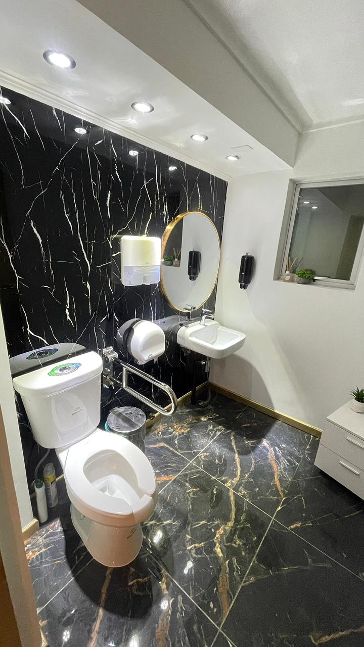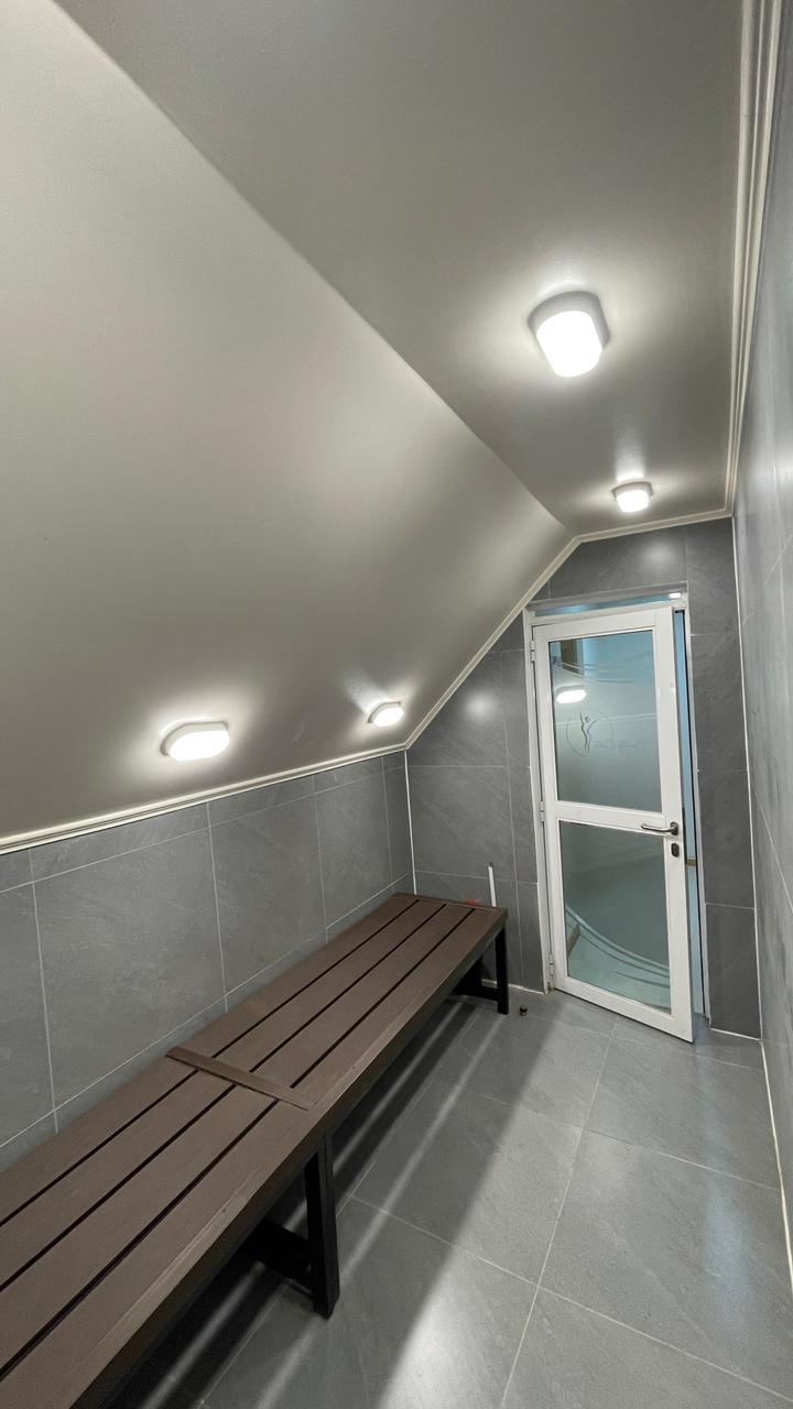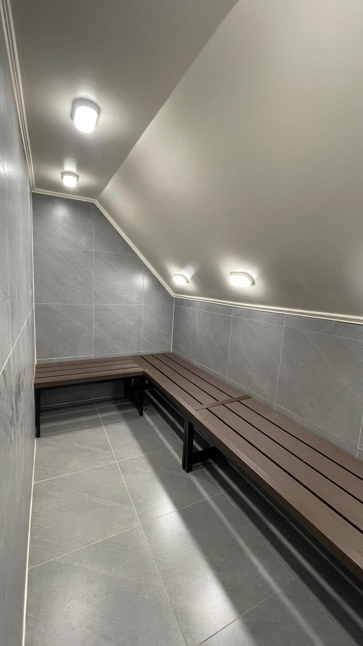 - Zona de spa y bienestar, diseñada con un enfoque de confort y relajación, incorporando revestimientos cerámicos en tonos neutros, bancas continuas de alta resistencia, iluminación puntual empotrada y una atmósfera controlada que potencia la experiencia del usuario.